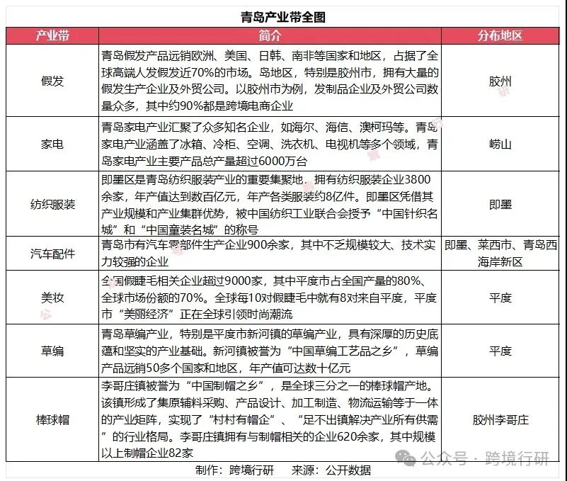 青岛制造业门类齐全,产业带链条完整、基础雄厚,目前已形成假发、家用电器、纺织服装、汽车配件、美妆、棒球帽等优势产业带,“跨境电商+产业带”有广阔的融合发展空间。