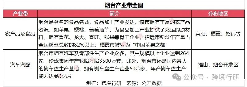 烟台市跨境电商产业带涵盖了多个领域,如农产品、食品加工、汽车汽配等。