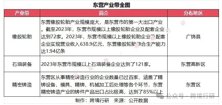 东营市位于山东省北部、渤海西南岸,东营是山东数一数二的工业强市,二产占比居山东之首。依托丰富的石油资源,聚焦橡胶轮胎、石油装备、精密铸造、汽车零配件等特色产业,实施“跨境电商+产业带”培育行动。